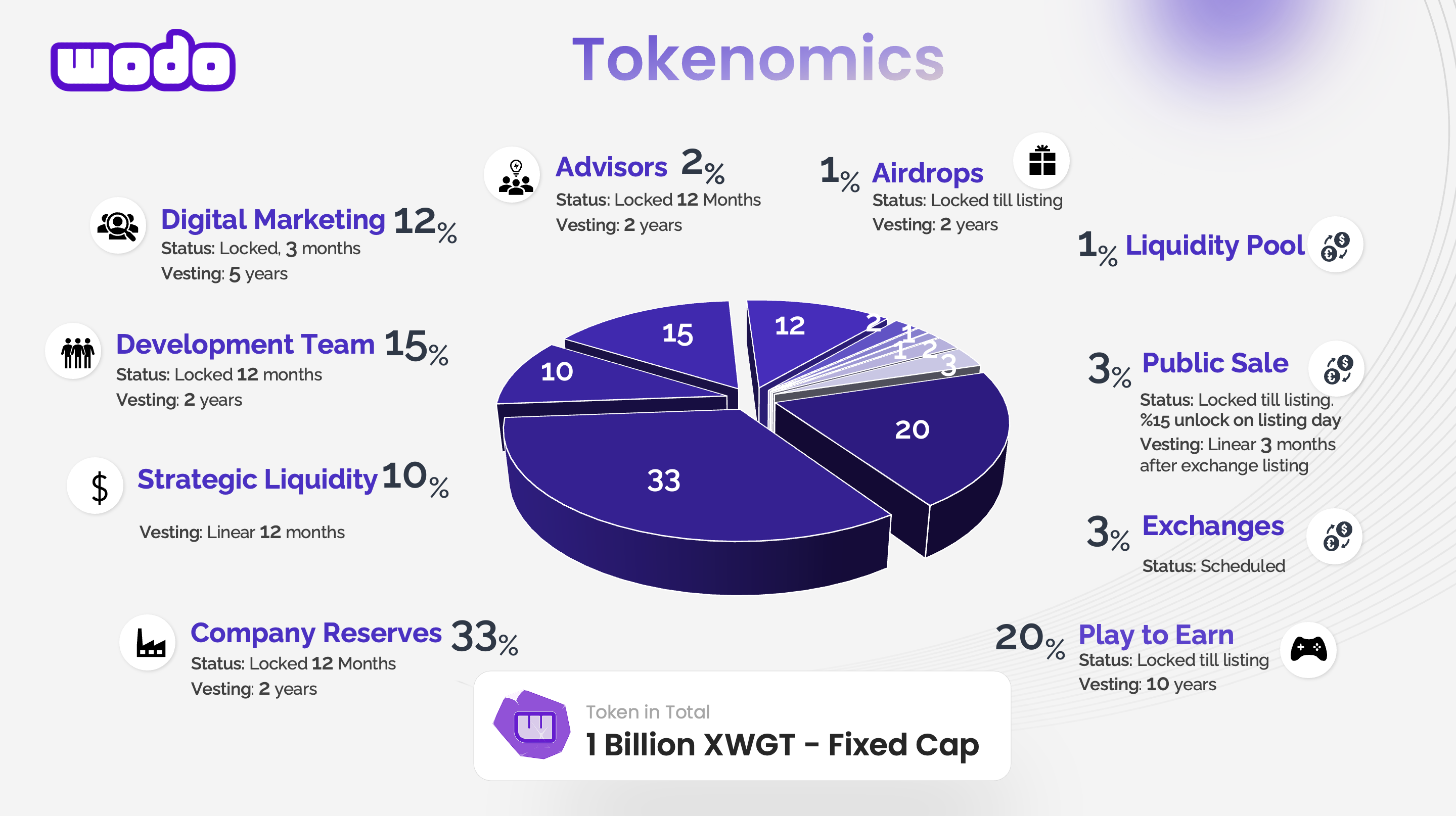 Wodo Gaming Token (XWGT) is the foundational token used to store value for investment purposes in the wodo gaming ecosystem.
