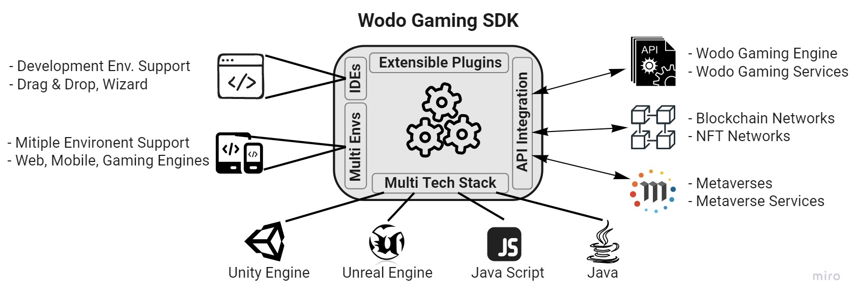 - Multi Environment Support: The SDK supports multiple run time environments - mobile, web and virtual reality - as well as multiple game development platforms - Unity Engine, Unreal Engine, JavaScript.